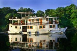 Desayuno. Cita en el lobby del hotel Tropical a las 14:00 hrs., embarque y salida hacia Río Amazonas, disfrutaran de una copa de bienvenida, además de escuchar la información sobre la ruta y las instalaciones. Después de una merienda, reunión en la sala de conferencias para informar sobre la ecología amazónica, mientras el buque los llevará río arriba el Amazonas. Antes de la cena ya pueden pedir una caipirinha, la bebida nacional de Brasil. Después de la cena podrán explorar la orilla del río `s con potentes reflectores y verán caimanes, parientes cercanos del cocodrilo, a veces halcones nocturnos, serpientes, ratas toro, la pereza y las ranas.